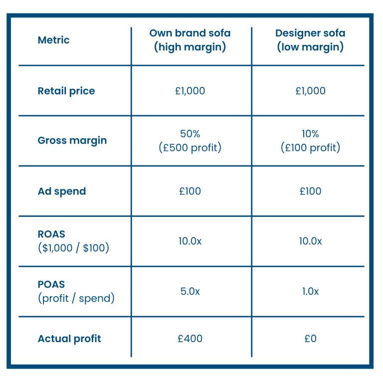 Without POAS, your automated bidding algorithms (like Google’s Target ROAS) will treat both sofas equally.